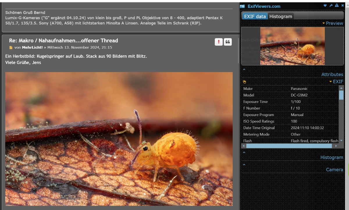 Mit Blitz macht die G9m2 focus bracketing mit max 4.6 Bilder/s - mehr habe ich nicht geschafft (siehe Blitz-thread im G-Unterforum). Der Godox V860iii schafft diese Rate dann mit bis zu 1/8 Leistung ohne zu stottern (wichtig, da beim Blitz-Nachladen Helicon über große Helligkeitsschwanungen meckert), die Leistung reicht dann für ISO100 bei f/10 mit dem ABM von 3:1 (EXIF ist im Bild).