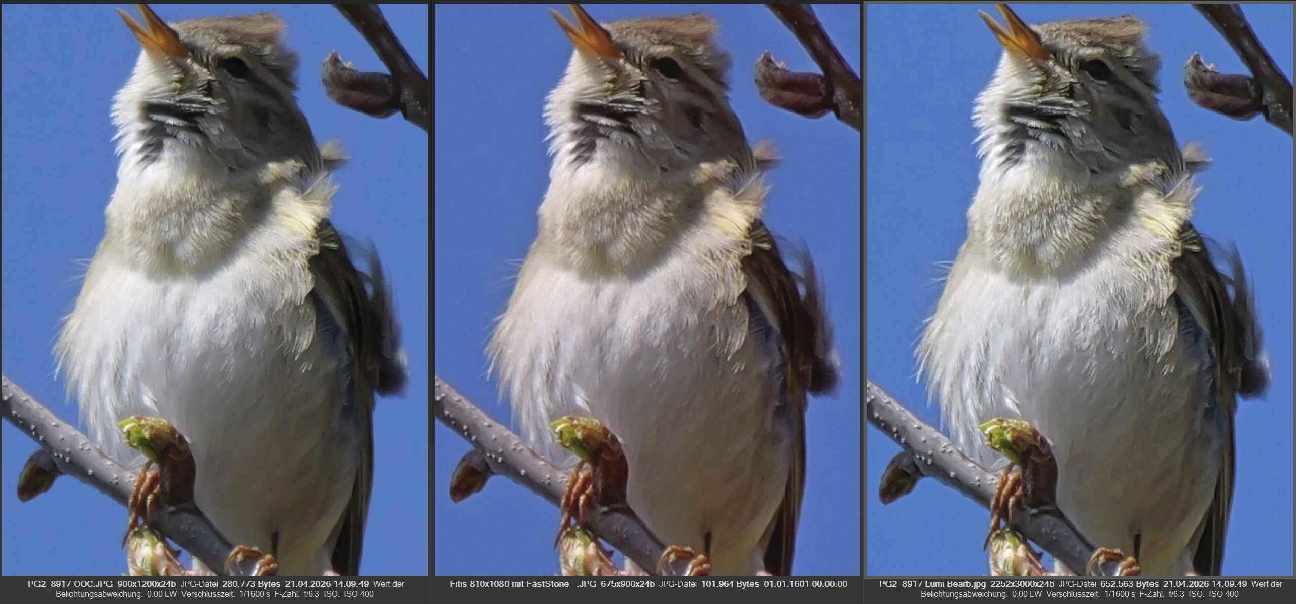 Ich habe gerade noch einmal den Vogel entwickelt mit Luminar Neo, der Vergleich ist hier herunterladbar.